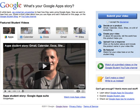 During my time at Google, I worked on a variety of web projects, big and small. One of the most significant was the creation of a brand new landing page: "What's your Google Apps story?" I worked with marketing to make a site that asked students to create and submit a video or written entry about how they used Google's products. The page also showcased the best video from each Google Apps category.