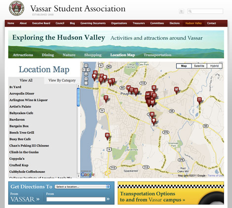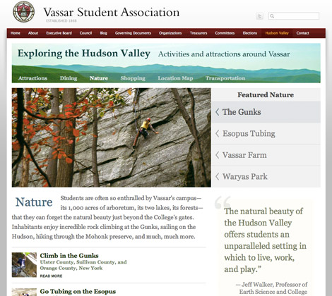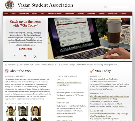 The Vassar Student Association serves, represents, and promotes the interests and welfare of the students. I began running the VSA's site in the Fall of 2008, following a year as an assistant. Each year I customized the site, originally designed by Slurve, to fit the needs, goals, and design taste of each administration; this often involved major design and code overhauls during the summers. The site runs on Drupal, while the VSA blog runs on a separate, yet visually identical, WordPress installation.