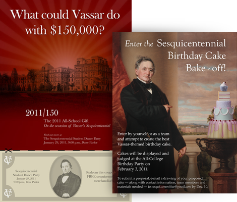Both of these designs were seen by the College's administration and used elsewhere. The background of the Gift ad made it into a brochure for the All-School Gift, as did the 2011/150 logo. The image of Matthew Vassar standing next to a birthday cake was used on the Vassar.edu homepage and on large banners at Vassar Sesquicentennial events around the world.